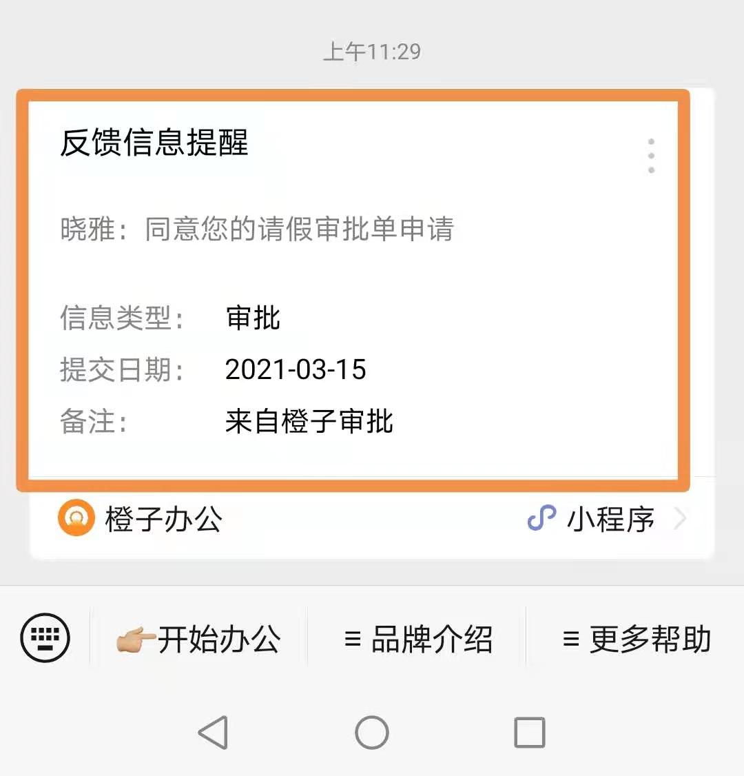 提交审批后,审批人会依次收到公众号“橙子办公”的推送信息,审批同意后,申请人也会收到相关推送提醒。