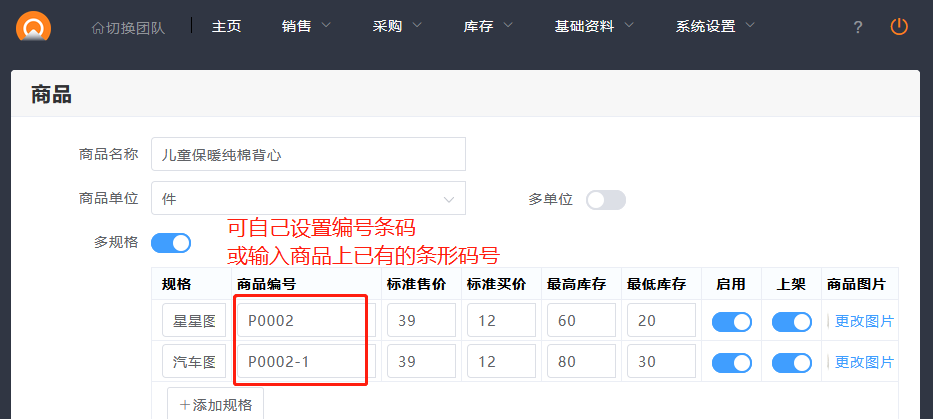 商品资料中有编号条码,这个编号不仅可以用于商品查询,还可以生成条形码,打印出来,贴在商品上,用于扫码出入库。