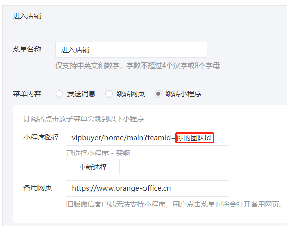 5.小程序路径:vipbuyer/home/main?teamId=你的团队ID,其中你的团队ID,可以在团队设置页的上方找到。