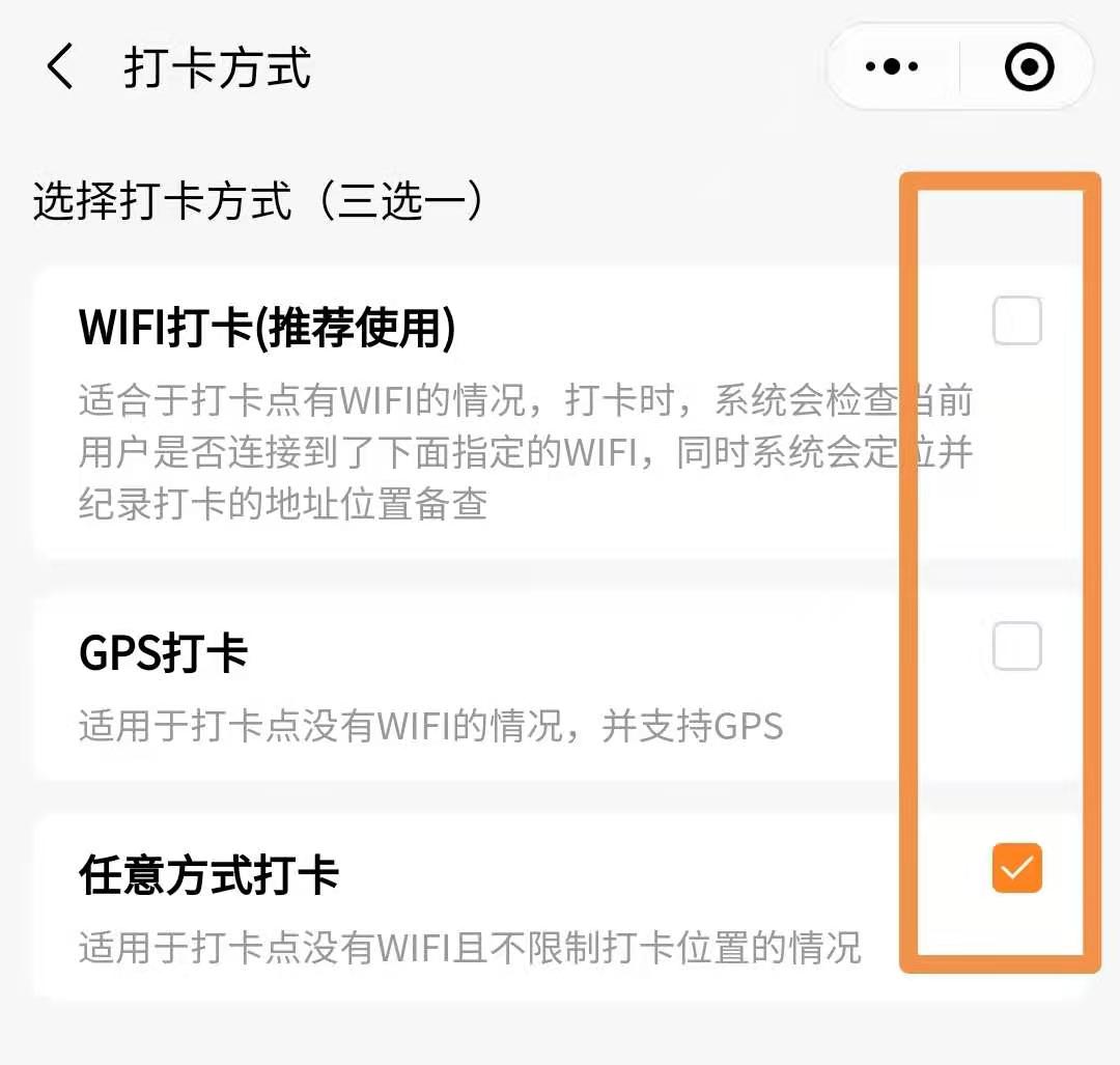 考勤打卡方式有3种,请大家根据各自的使用场景进行选择: