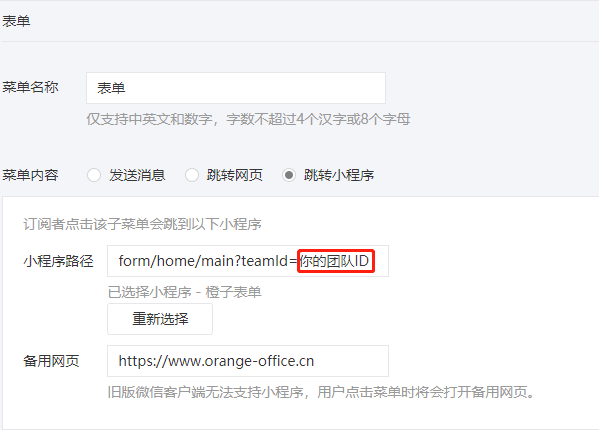 "pagepath":"form/home/main?teamId=你的团队ID"