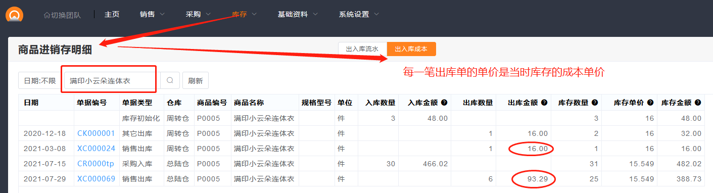 如果对某个商品的库存查询单价和金额有疑问,可以查询此商品的进销存明细,具体页面如下: