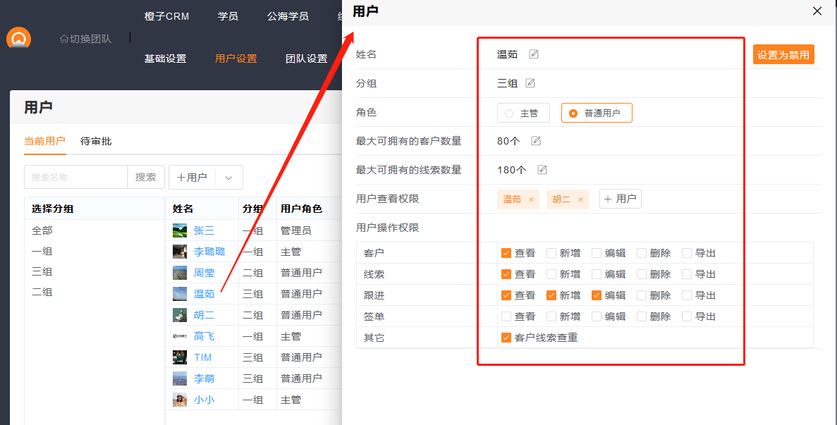 在团队成员及设置-成员设置-设置可看用户,可以设置某些普通用户能查看哪些其他用户的客户。