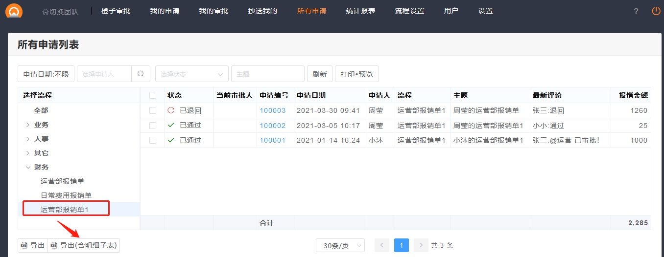 2.选择所有申请-左侧选择具体流程(一定一定要选择某一个审批流程),下方有显示导出、导出(含明细子表),点击即可导出。