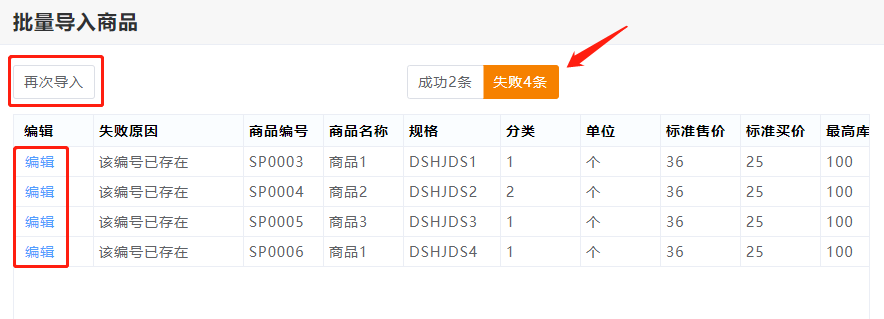 6.失败的数据,可再次导入,或者直接编辑保存。