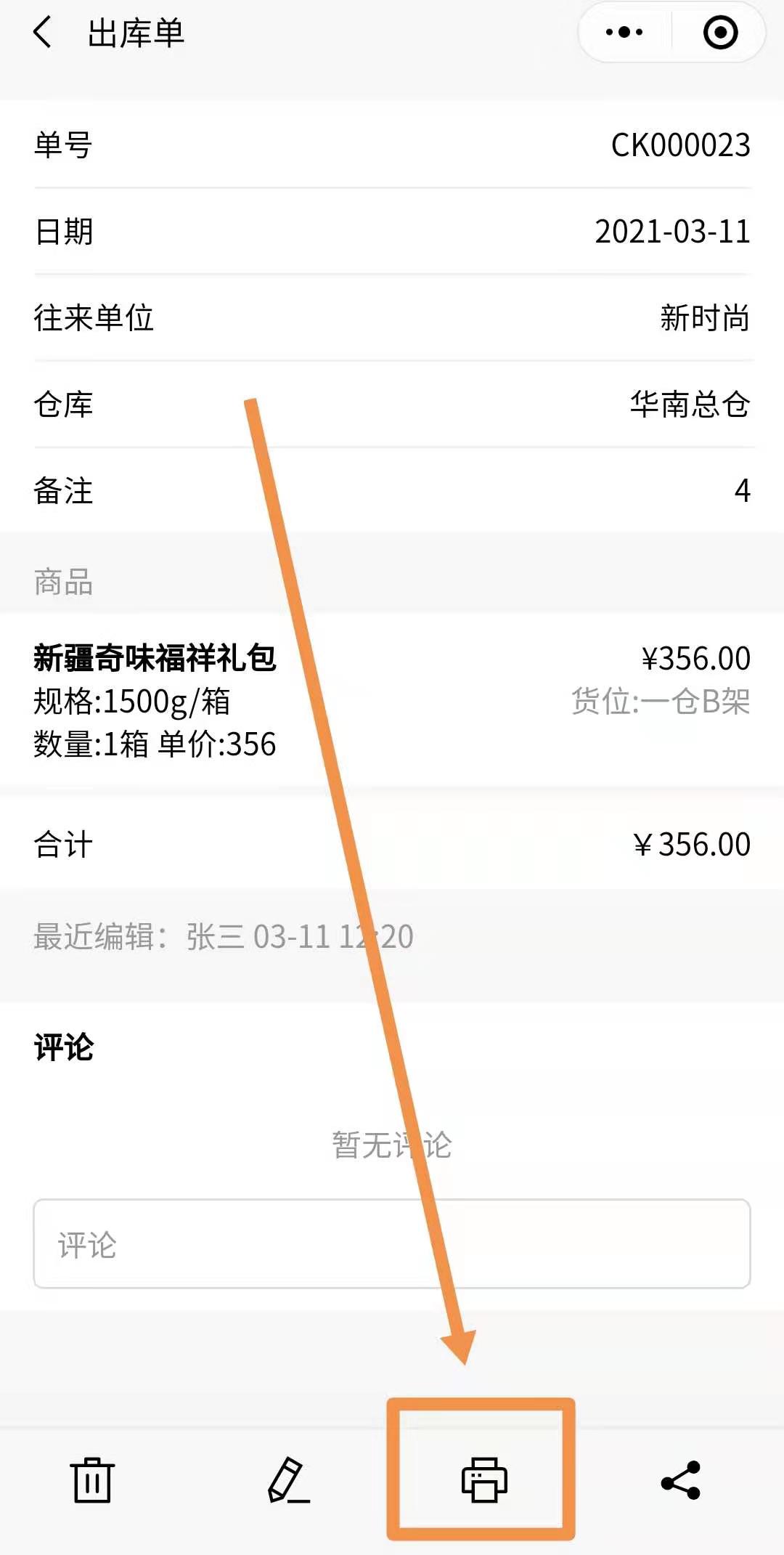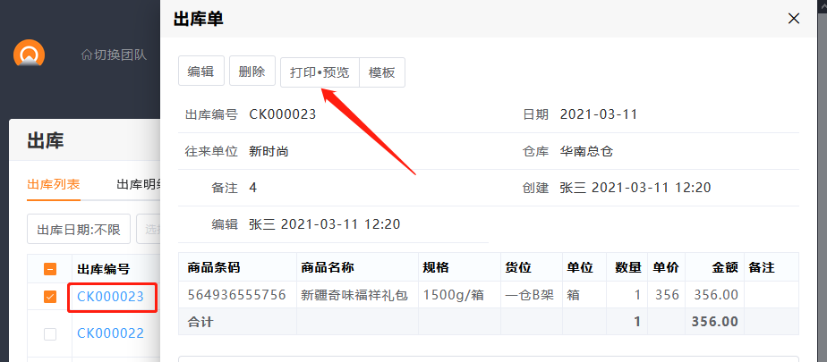 点击单据编号,进入单据详情,直接打印即可。