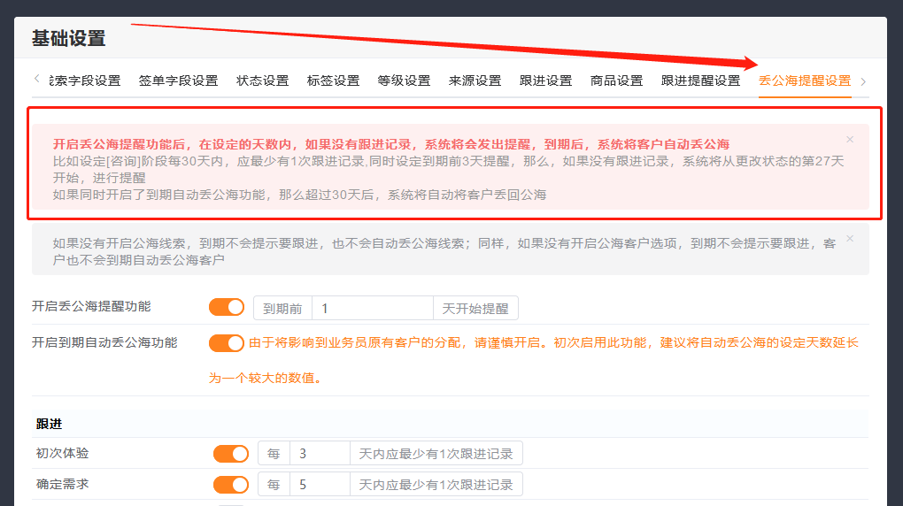 当状态变为“成交”后,需要业务员“1”天内跟进,“5”天没跟进就会直接丢到公海。系统会提前“1”天通知。