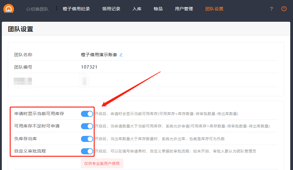 第一步是管理员在团队设置中配置好借用模块所需要的功能。