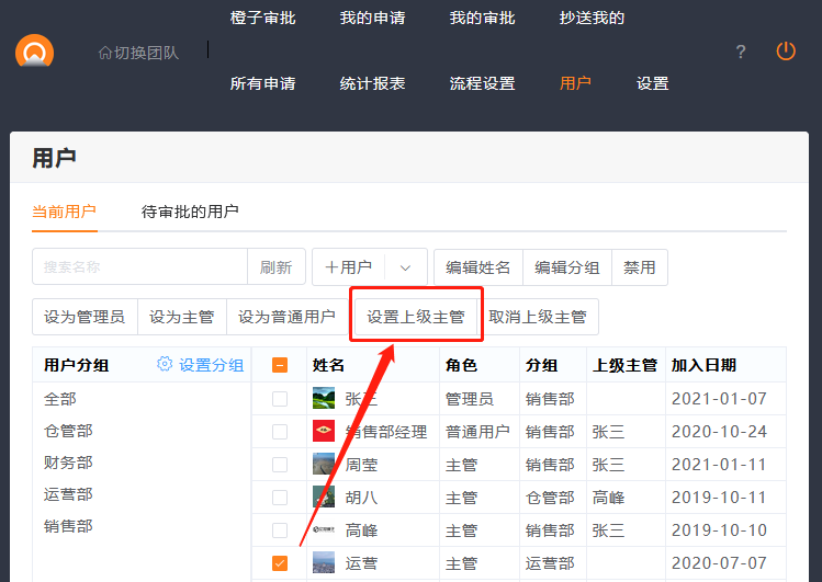 - 设为主管:拥有所有操作及数据查看权限,除团队设置及用户列表等