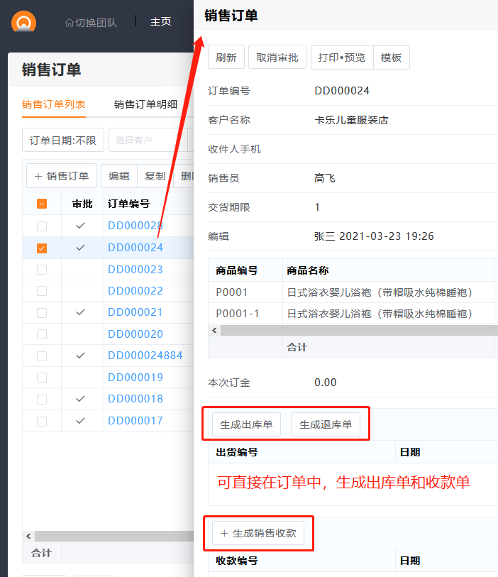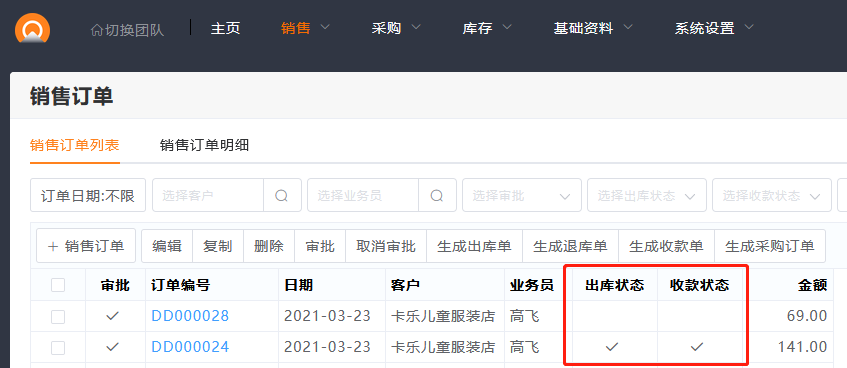 2.同时,我们可以在列表上看到订单是否完全出库,或者完全收款。