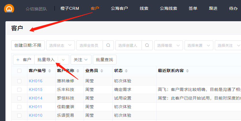 客户、公海客户、线索、公海线索,分别在对应的列表里导入。即在“客户”中导入客户,在“线索”中导入线索。