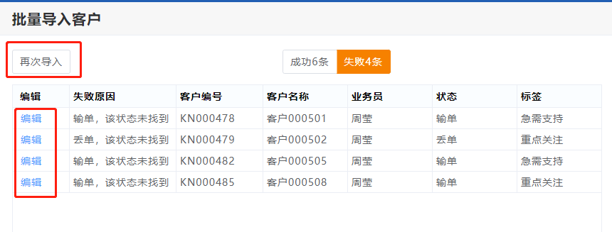 7.失败的数据,可以再次导入,或者直接编辑保存。