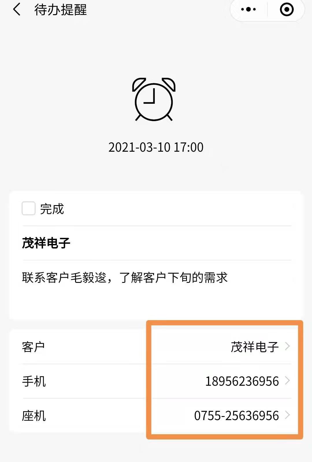4.可以直接点击进入提醒,点击电话或手机号,联系处理相关事宜。