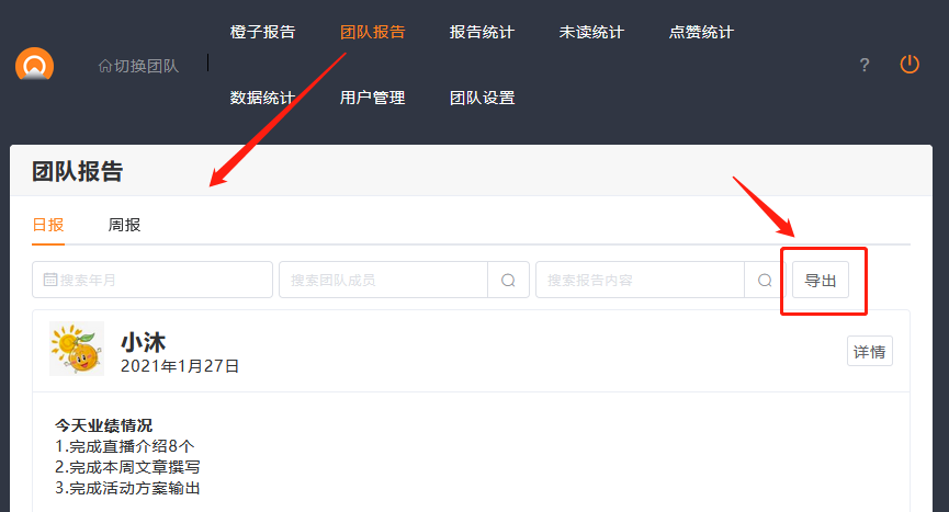 2.可在“团队报告”中筛选需要的报告进行导出。