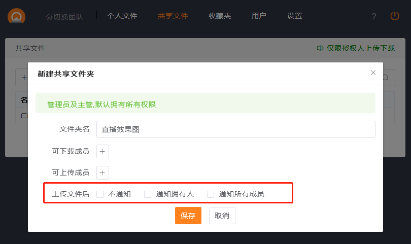 通知所有成员:上传文件,通知文件夹的可下载人员和可上传人员。
