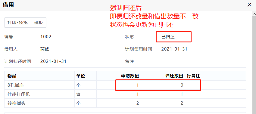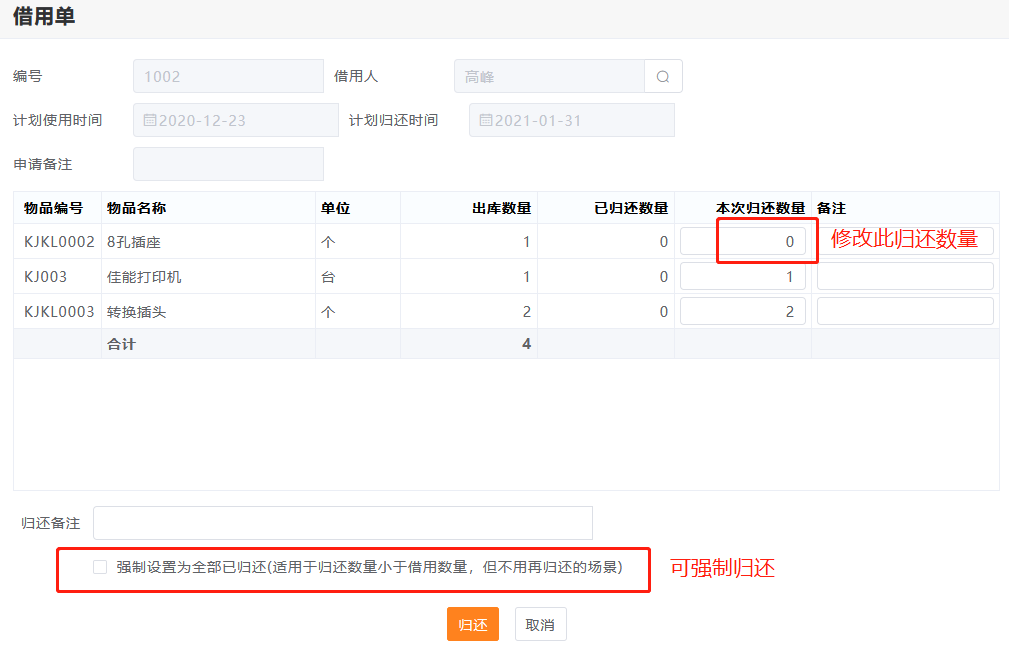 如果此时修改归还数量小于待归还数量,下方会自动显示强制归还按钮。
