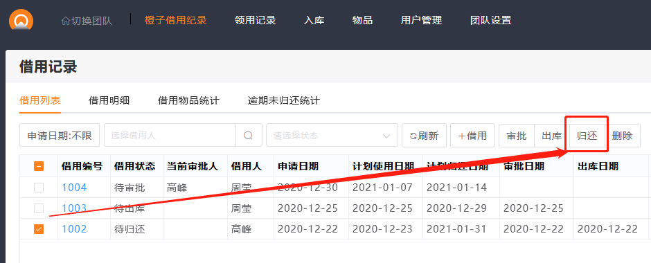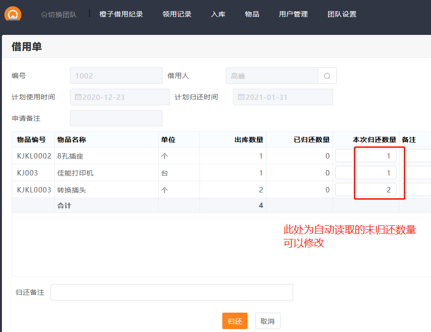 在归还借用物品时,选择借用单,点击归还时,系统会默认读取未归还的数量为本次归还数量。