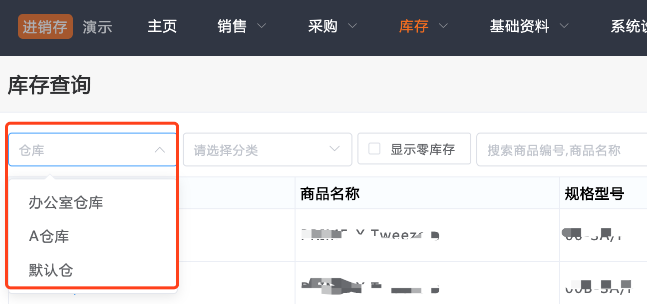 3.查询库存支持筛选仓库