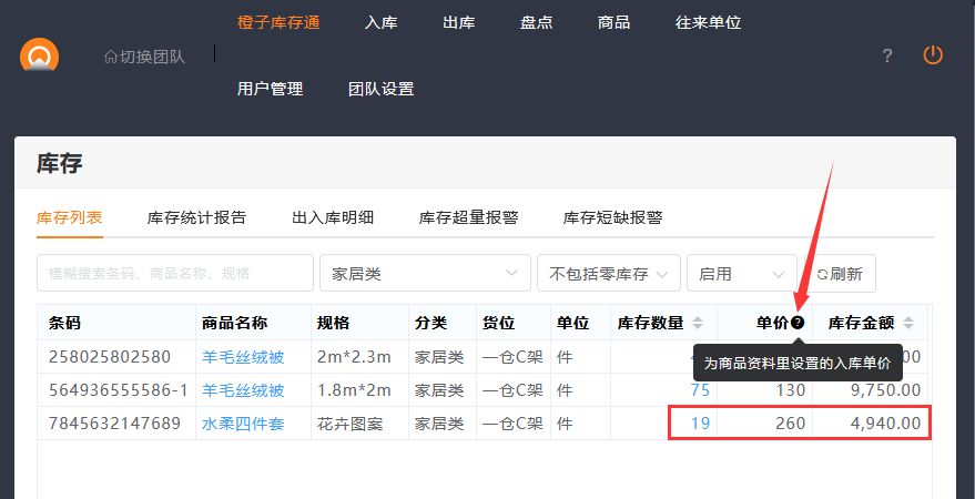 库存金额=库存数量*入库单价(商品信息中的入库单价,见下图2)。