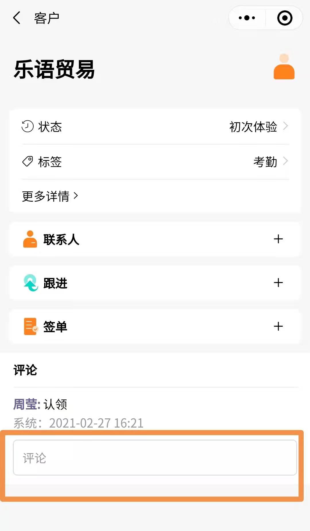 橙子CRM中,客户及线索都有评论区,评论区不仅可以发表文字信息,还可以上传附件,包括图片等。