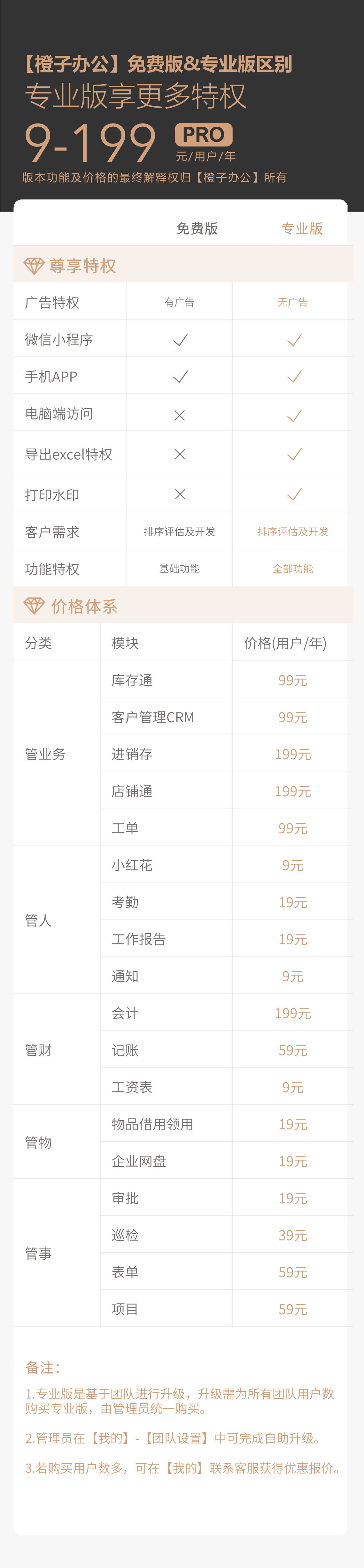 【橙子通】各功能模块价目表如下(用户数据取决于您的团队成员数量):