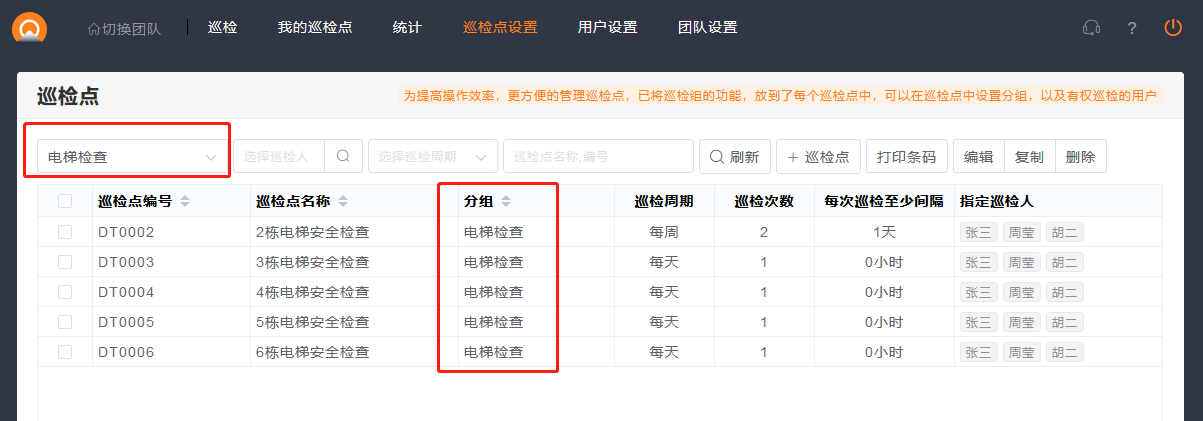 3. 在巡检点列表,可以筛选分组,来查看一系列巡检点的巡检周期和巡检人等。