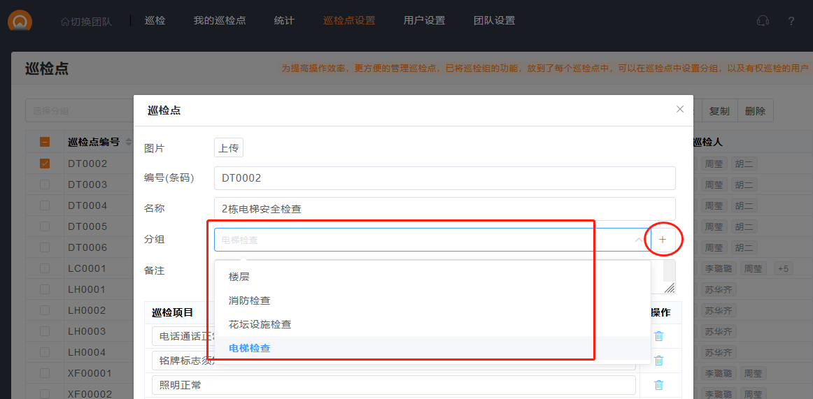 2.开启巡检组后,在巡检点设置中,可以选择对应的巡检组。