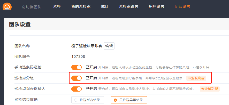 1.管理员在团队设置中,开启巡检组