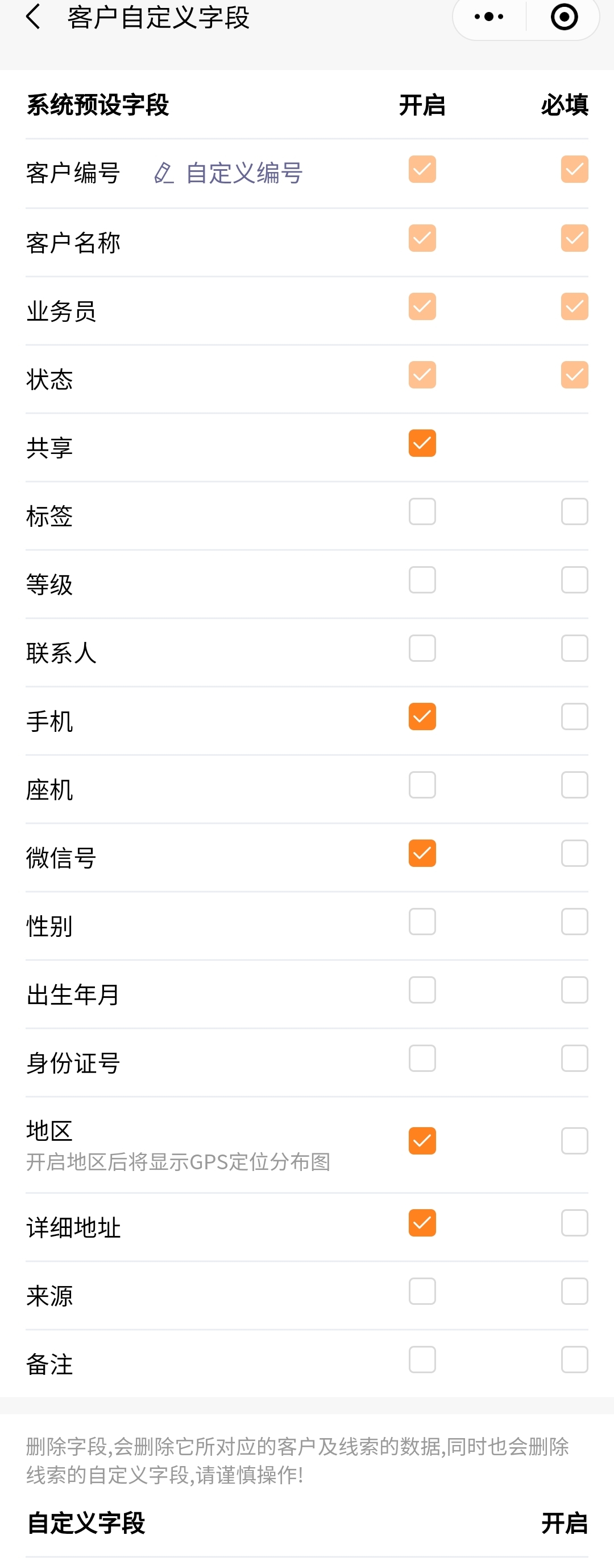 - 自定义字段删除,原有对应的客户信息也会删除,谨慎操作。
