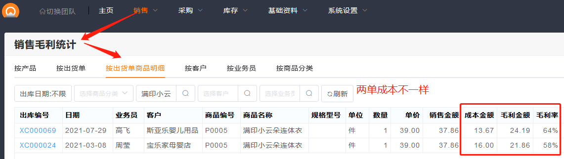例如以下两单出库单价一样,但是由于成本单价不一样,毛利不一样。