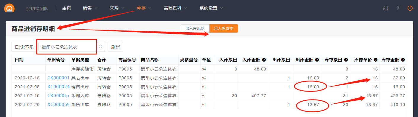 选择商品,进入出入库成本,查看对应单据当时的成本。