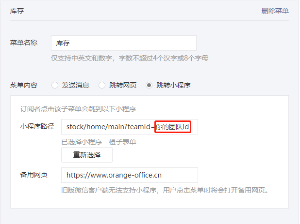 5.小程序路径:stock/home/main?teamId=你的团队ID,其中你的团队ID,可以在团队设置页的上方找到。