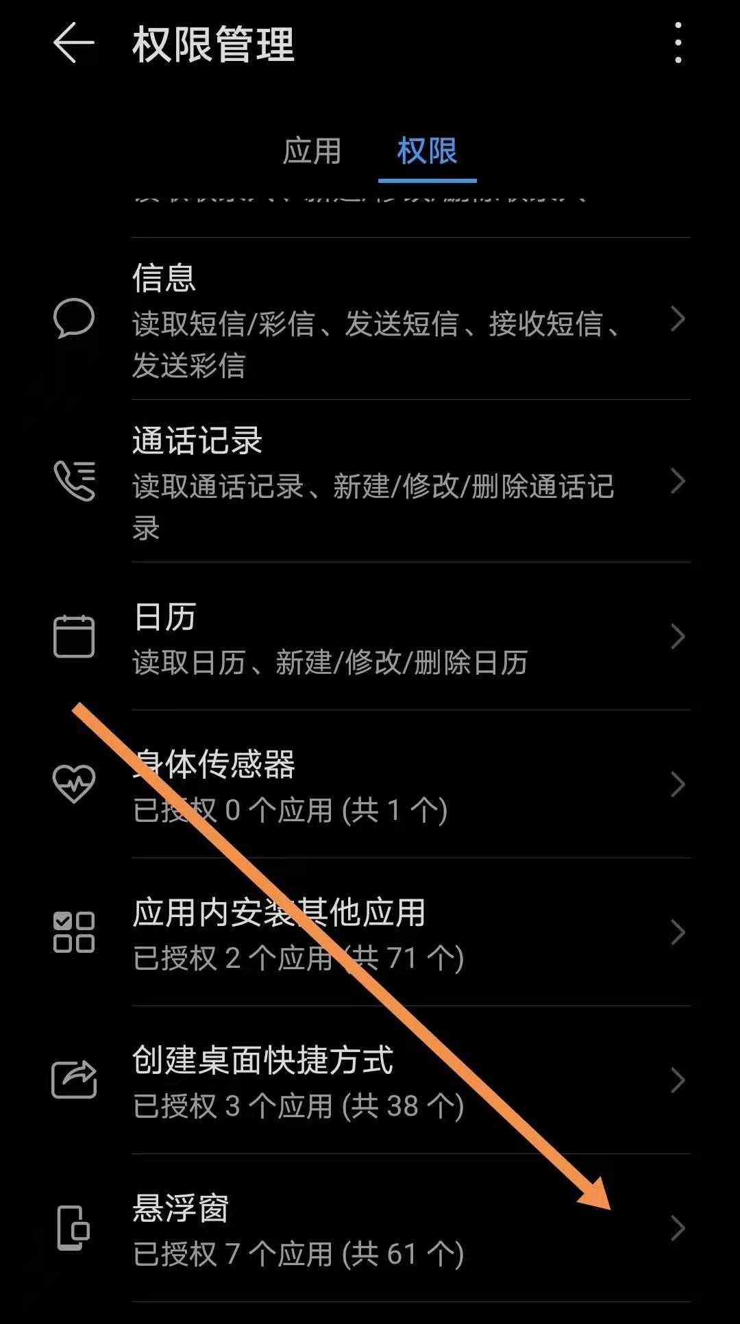 4.进入权限管理后,找到---悬浮窗,然后点击进入。