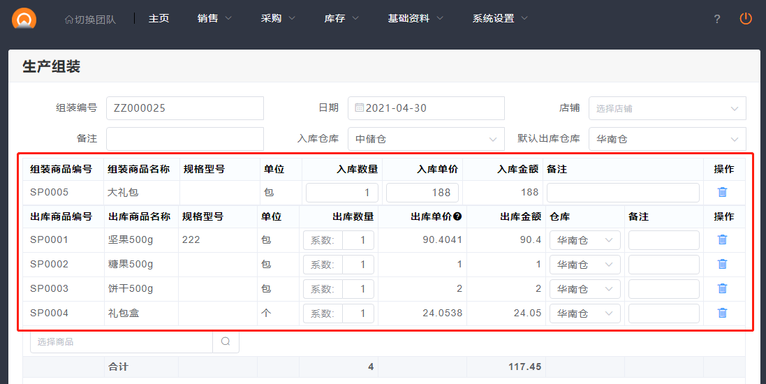 例如: 超市有商品500g坚果、500g糖果、500g饼干等,为了节日促销,需要将这三种商品及一款包装盒组成大礼包出售,那么则需要使用此生产组装单。