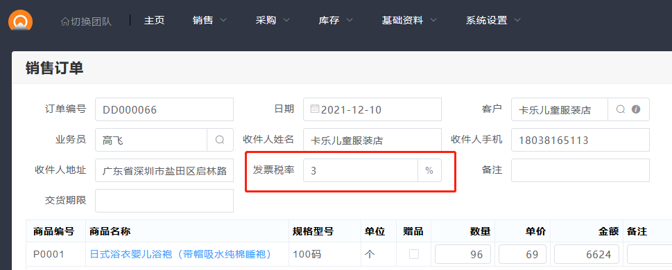 2.开启并设置后,新增单据时,会显示对应的税率,也可以手动修改税率。