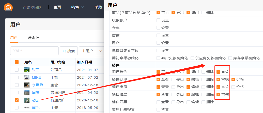 只有拥有“审核”权限的成员才能对相应单据进行审核。