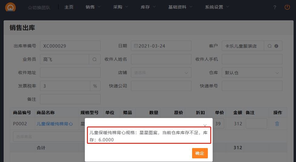 为了保护单据的正常执行,【橙子进销存】默认的是,库存数量不足时不能做出库单。
