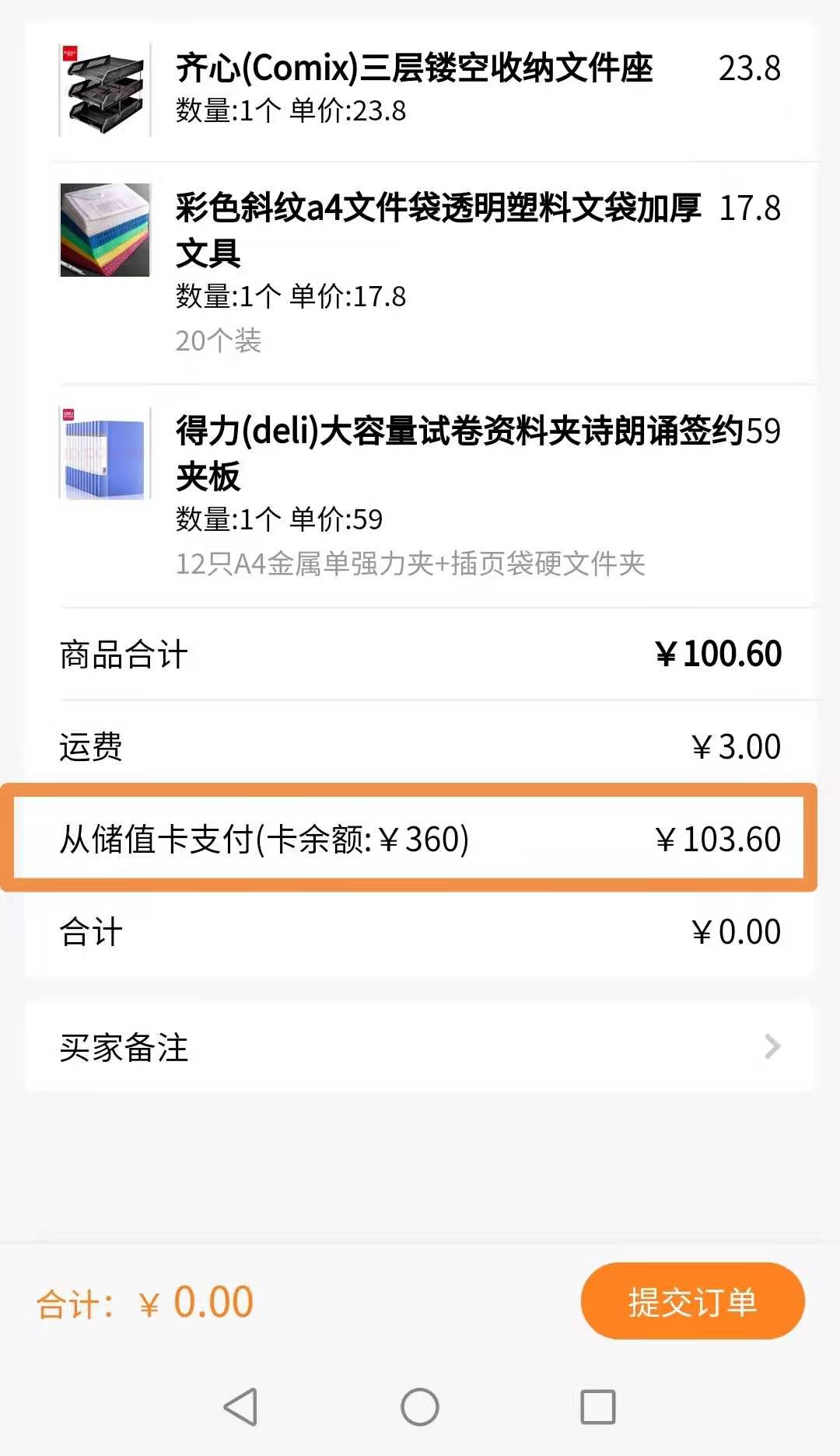 如果会员在买啊直接下单,也可以直接扣减储值卡的余额,抵扣货款。