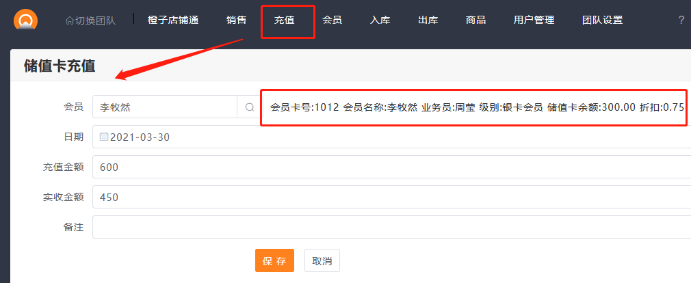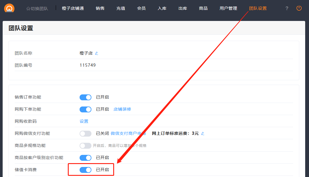 1.管理员在团队设置中,开启储值卡消费功能后,会增加充值模块。