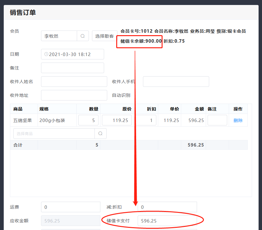 3.后期新增销售单,选择会员,会显示该会员的储值卡余额,同时可以直接扣减储值卡金额用于支付