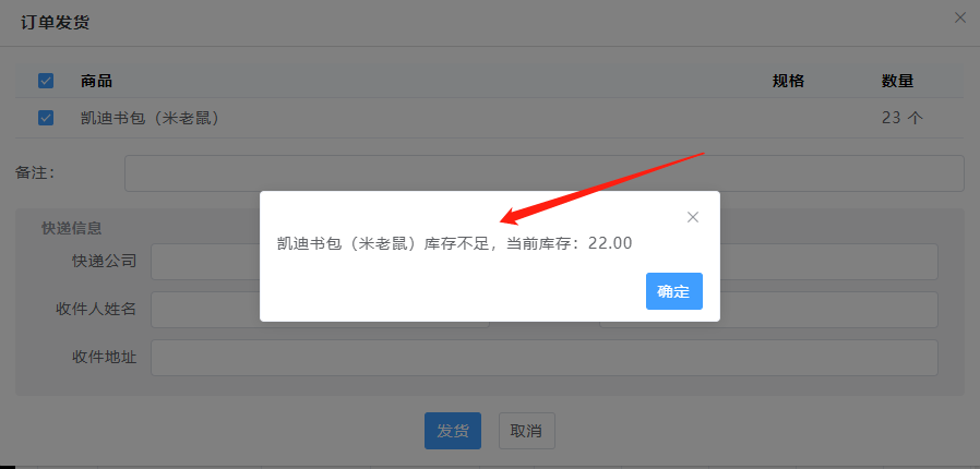 未开启负库存功能时,当出库数量超过库存数量时,系统会有提示: