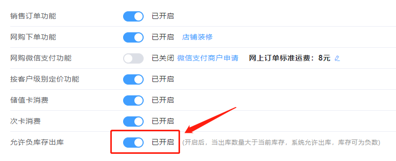 如果库存不足仍需要记录销售,此时可以在团队设置中开启负库存功能。