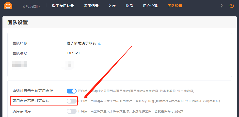 1.管理员可以在团队设置里,关闭可用库存不足时可申请功能,看看效果。