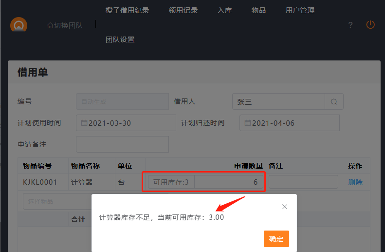 未开启时,团队成员提交申请时,申请数量大于可用库存数量时,会有提醒库存不足,不允许提交申请。
