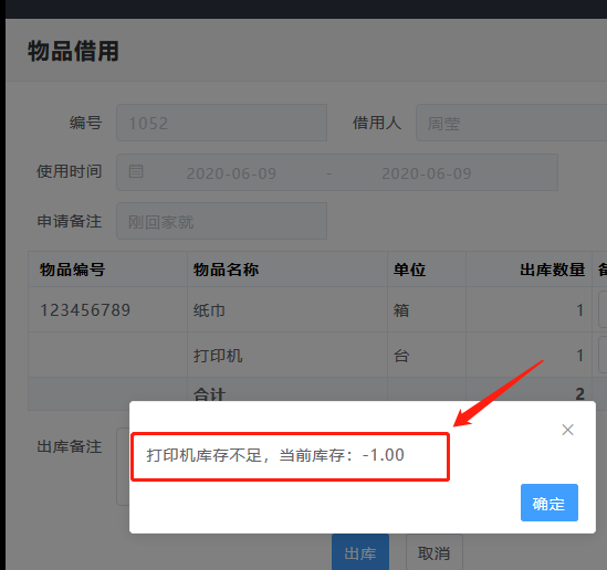 未开启允许负库存出库功能时,已审批的借用申请,点击出库时,会有提醒库存不足,不允许保存出库单。