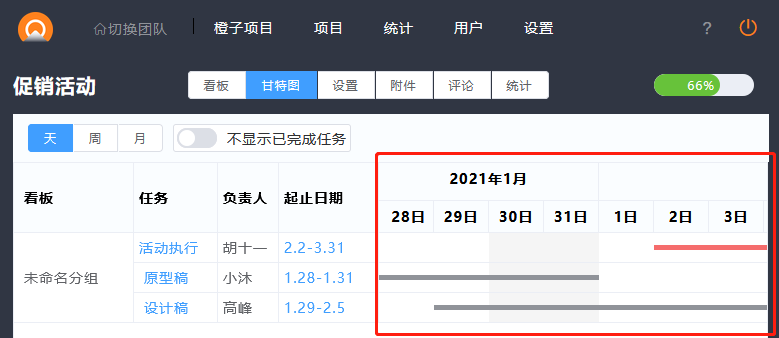 系统根据项目里每个任务的起止时间形成进度条,最后形成甘特图,方便管理者更好的跟进进度。