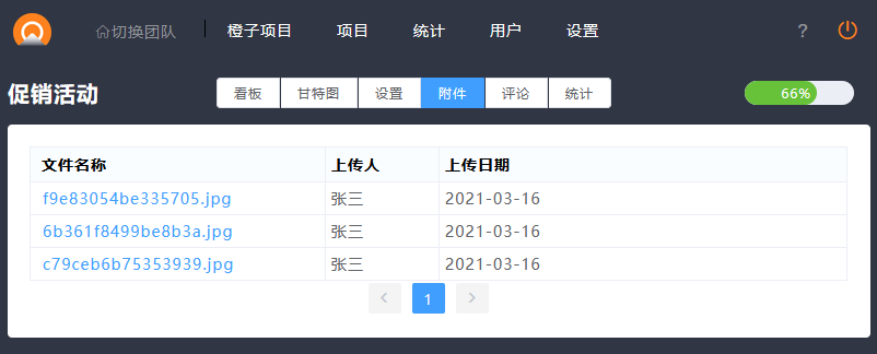 【橙子项目】提供项目附件库,可以直接查看该项目所有的附件,提高查找的效率。