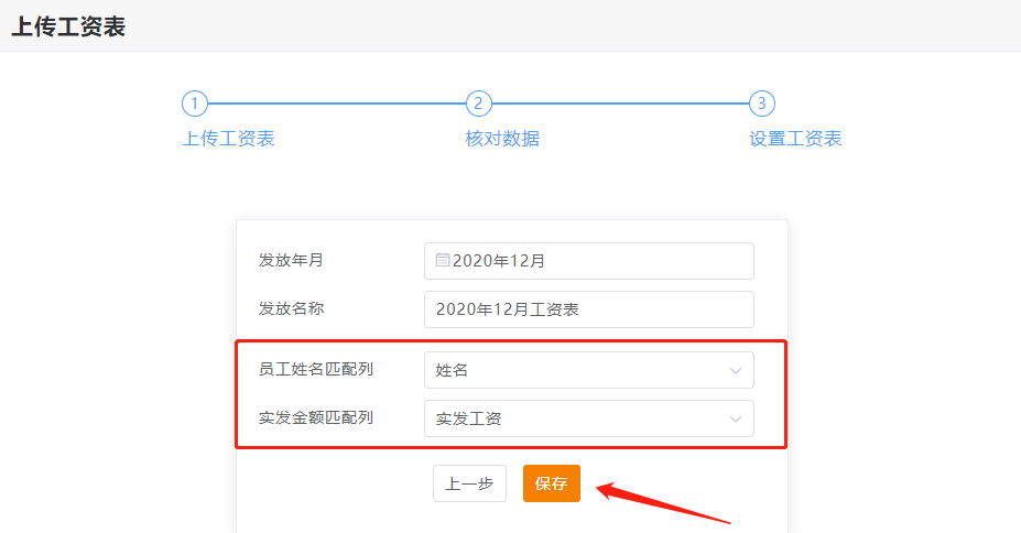 4.设置对应的员工姓名匹配列和实发金额匹配列,保存。