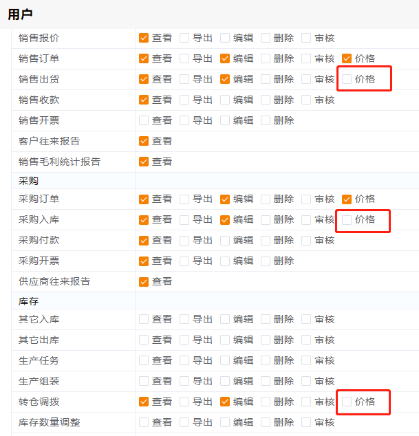 为普通用户设置操作权限时,部分单据有一个价格权限,勾选则是可以显示价格,不勾选则是不能显示价格。