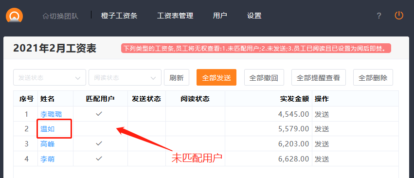 其中第一项未匹配用户,指的是上传工资表后,匹配项为空,则发送后,相关人员也不能收到。